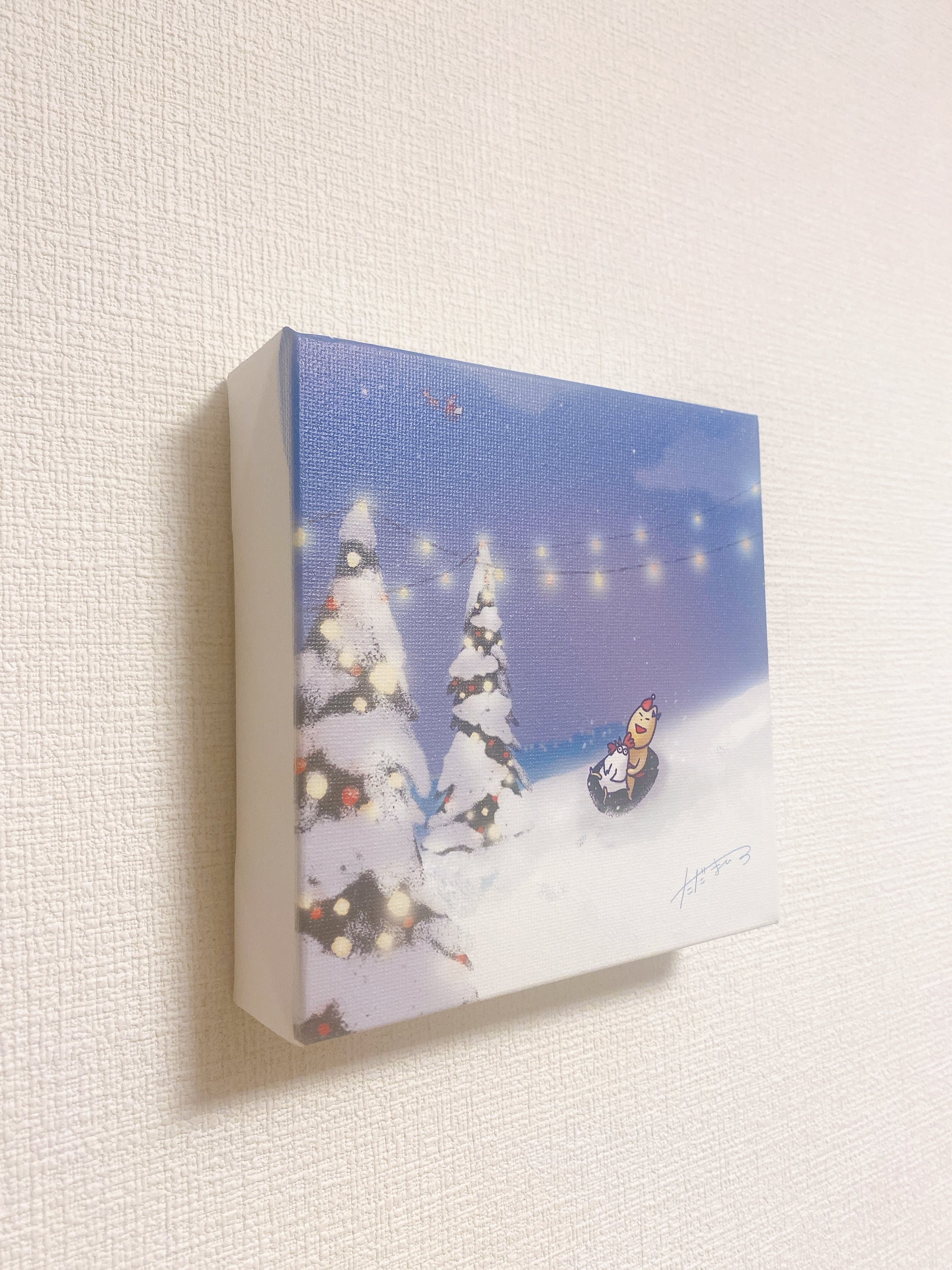 約15cm角のコンパクトサイズながら、厚みがあり自立する特製アート。立体感のあるキャンバスに、特別なクリスマスアートをプリントしました。棚やデスクに気軽に飾れ、お部屋をパッと明るく彩るインテリアの主役になります。